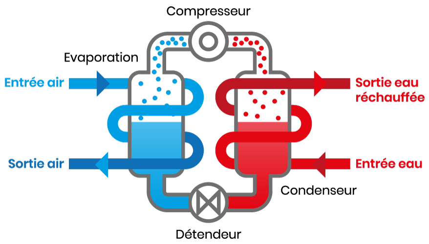 Pour commencer, intéressons nous au fluide caloporteur.  Ce dernier, qui transporte les calories au travers de l’appareil, est présent sous forme liquide.